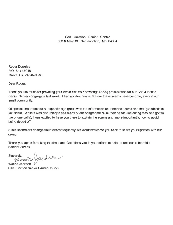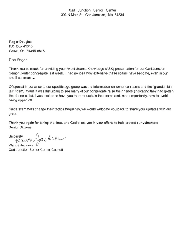 "Thank you again for taking the time, and God bless you in your efforts to help protect our vulnerable Senior Citizens." ~ Wanda Jackson, Carl Junction Senior Center Council